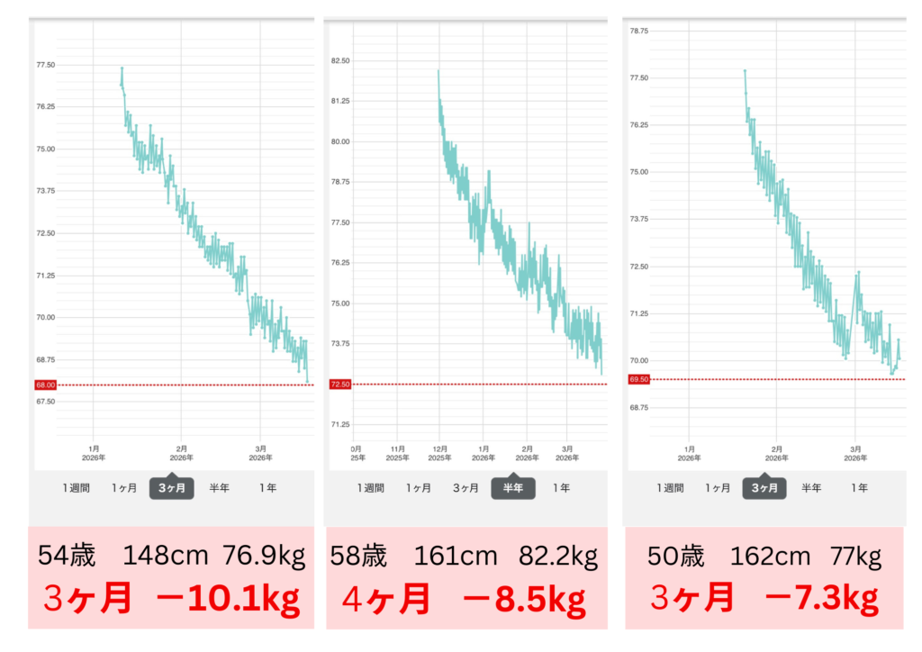 体重が落ちると、血圧や血糖値の数値も下がり、薬が減ったとの嬉しい報告もいただきます!